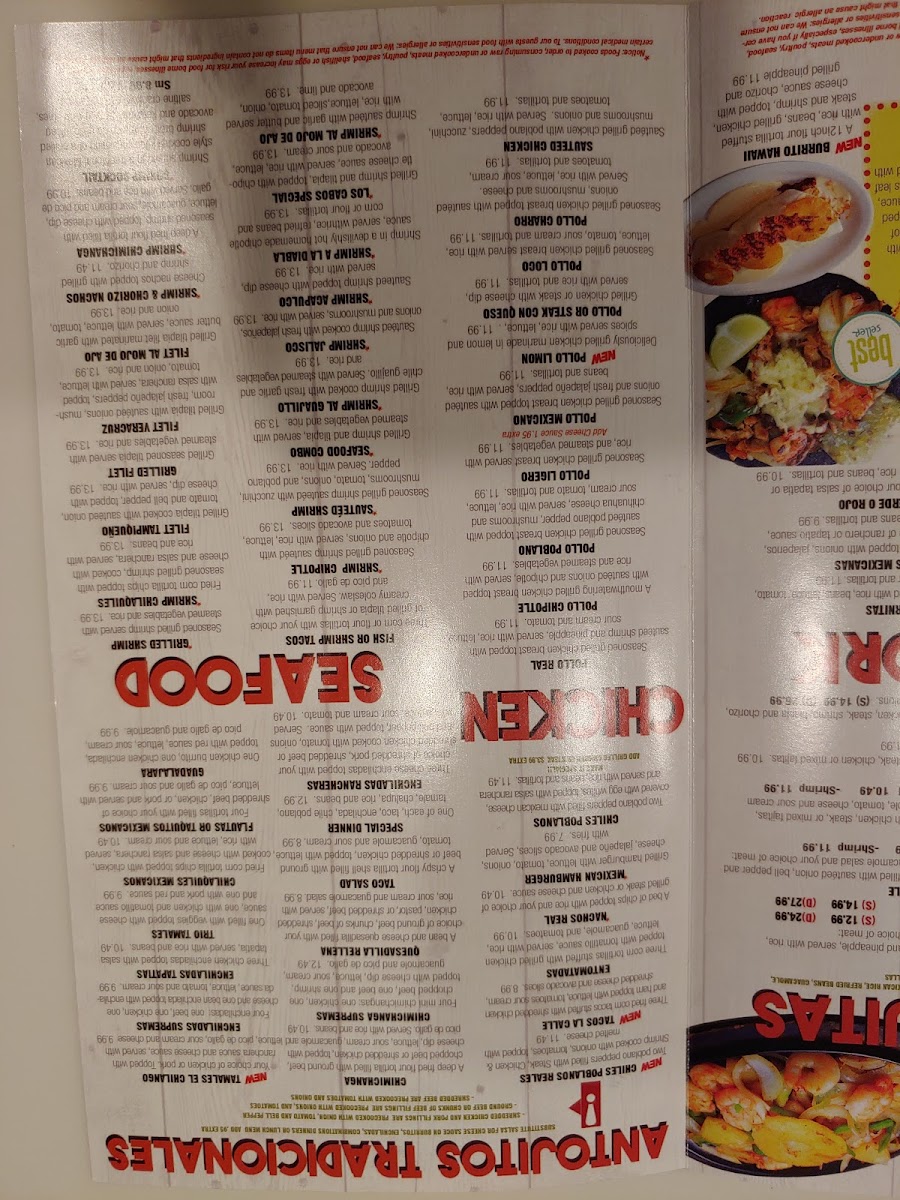 Shrimp in a devilishly hot homemade chipotle sauce, served with rice, refried beans and com or flour tortillas.